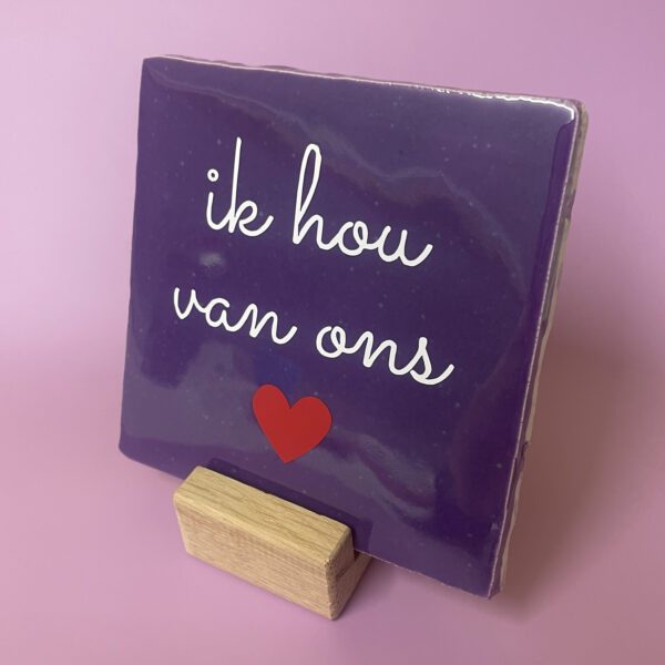 Dit witte tegeltje heeft een ontwerp met de tekst ‘Ik hou van ons’ die er in het zwart op staat, En daarbij ook een rood hartje.