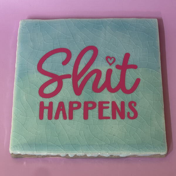 Dit Witte tegeltje heeft een ontwerp met de tekst ‘Shit Happens’ die er in het rood op staat.